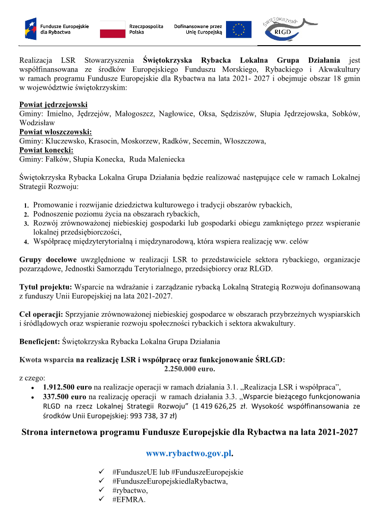 Realizacja LSR stowarzyszenia Świętokrzyska Rybacka Lokalna Grupa Działania jest wspófinansowana ze środków Europejskiego Funduszu Morskiego, Rybackiego i Akwakultury w ramach…
